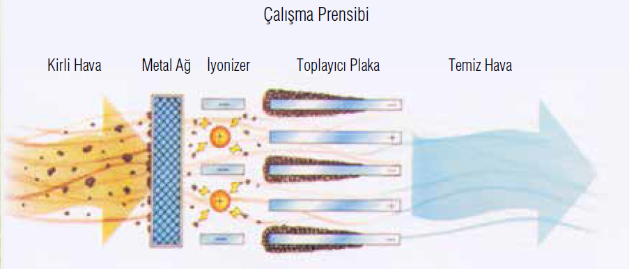 Hava motor / üfieyici tarafından büyük toz parçacıklarını tutan yıkanabilir metal kafesli bir ön filtre vasıtasıyla emilir. Kalan parçacıklardan 0,01 mikron kadar küçük olanlar, elektrik yüküyle yüklendikleri güçlü bir elektriksel alana geçerler. Yüklü parçacıklar daha sonra eşit aralıklı paralel plakalardan yapılmış kollektör plaka kısmına geçerler. Araya eklenmiş plakalar topraklanmış olup partikülleri çekip toplarken, birbirini sırayla takip eden her plaka parçacıklarla aynı kutupta elektrikle yüklenir ve bu durumda da partikülleri iterler.